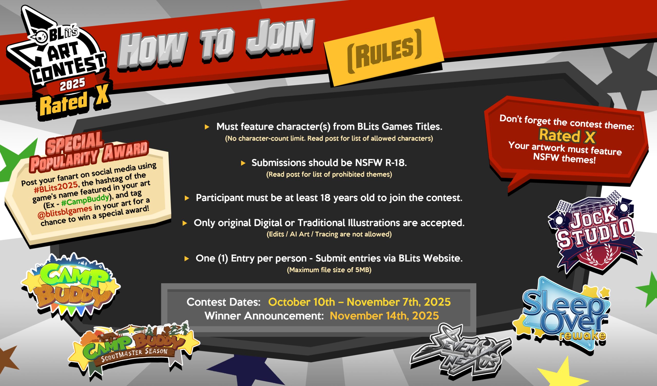 Like we announced on our start-of-the-month update, today kicks off the First Official BLits Art Contest! What makes this contest different is that, unlike previous single-game focused contests, participants can use characters from any of our games, including titles like Jock Studio, Seven Nexus, Sleepover: reWake and even BLits Original Characters!