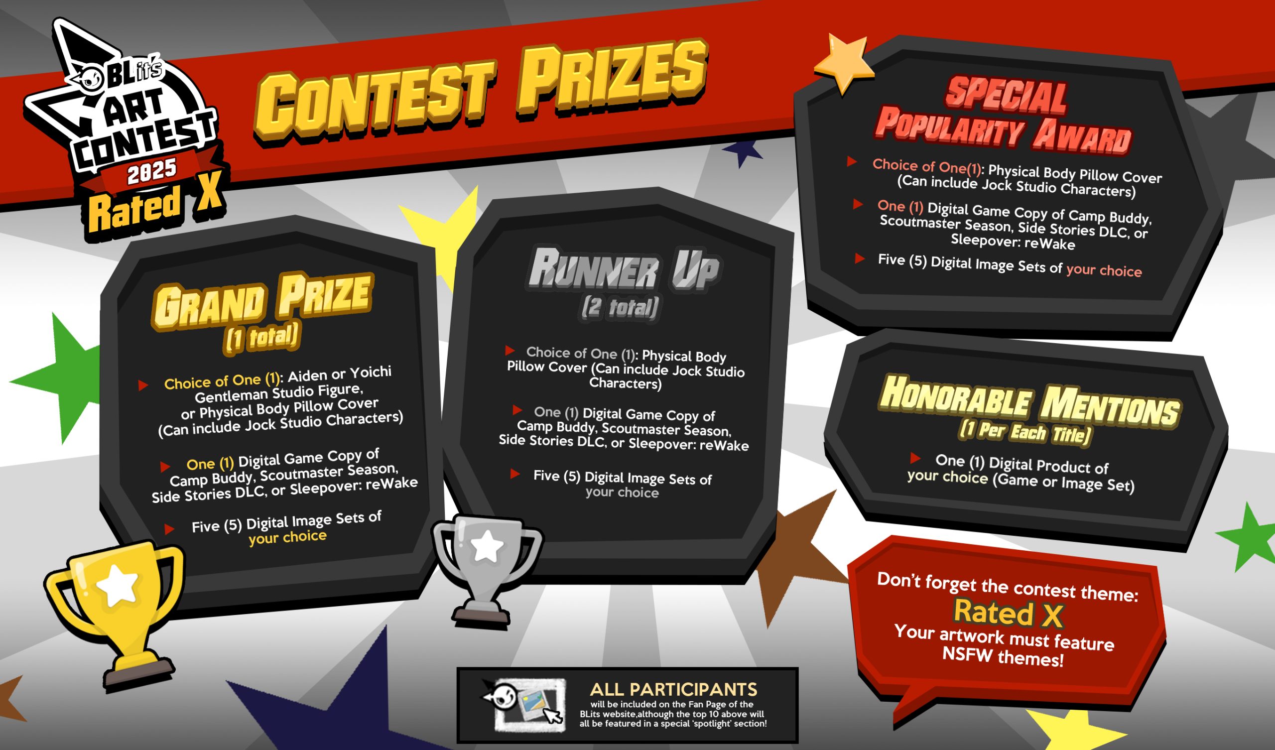 Finally, we’ll have five Honorable Mention winners, one for each of the various BLits Games titles – Camp Buddy, Scoutmaster Season, Jock Studio, Seven Nexus, and Sleepover: reWake! Outside of the other winners, the BLits Team will choose five artworks that we feel best represent these respective titles and the theme and grant them the Honorable Mention award!