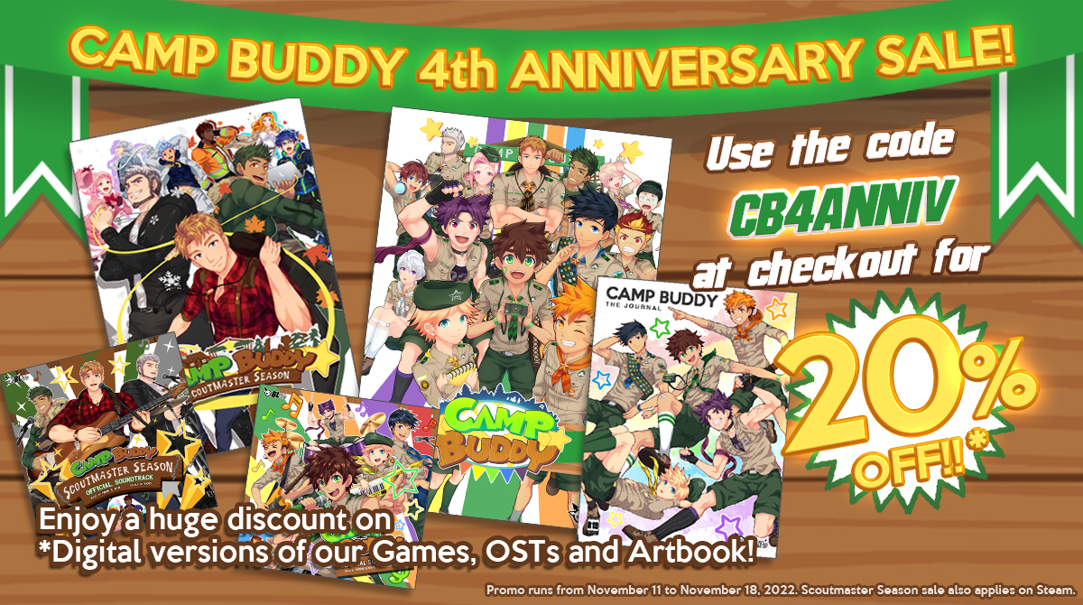 Finally, we’ll be holding a sale for Camp Buddy, Scoutmaster Season, the Artbook and both game’s soundtracks this month, as well as all of their bundles, for 20% off regular purchasing price! If you’ve been thinking about getting either of these games, now is the time to buy!