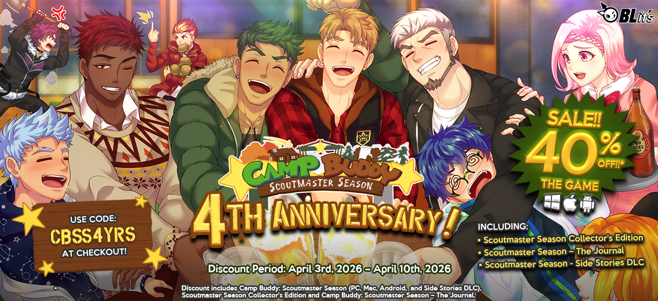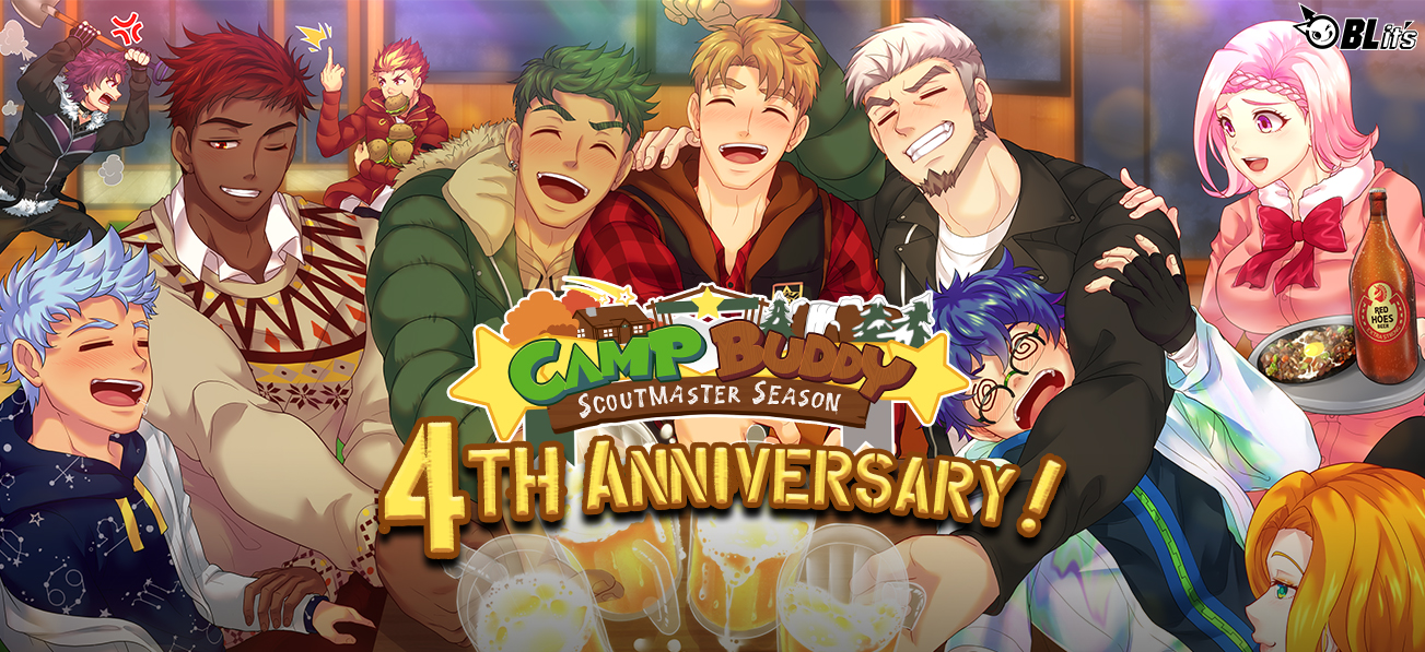 Happy anniversary, buddies! It’s been Four Years since Camp Buddy: Scoutmaster Season first released, and it’s time to celebrate! Since Scoutmaster Season released, we’ve provided tons of new and exciting content for the game, including the Scoutmaster Season Journal, several free updates, Body Pillow Covers, and even an exciting, first-ever downloadable content last year, the Side Stories DLC!