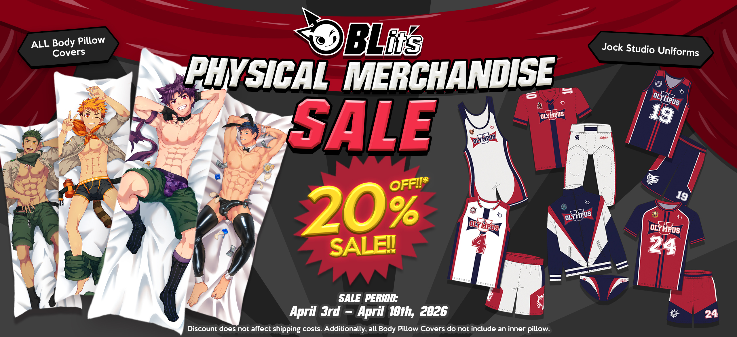 This discount includes body pillow covers, Jock Studio uniforms, and more, so be sure and check-out the webstore to take advantage while you can, buddies!