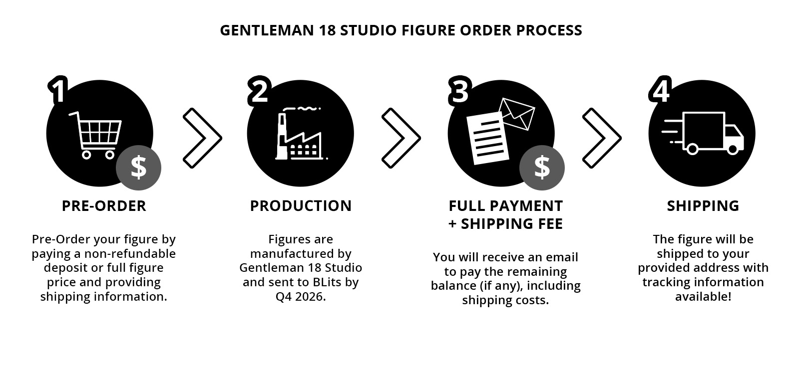 - Deposit: You will be charged a one-time, non-refundable payment of $69. Once manufacturing is complete, you will settle the remaining 150 USD balance plus the shipping cost when the figure is ready to ship.
