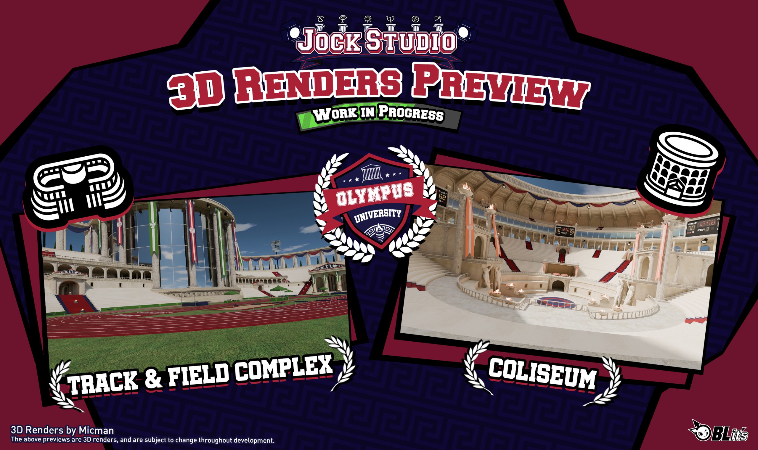 Over the last couple months, we’ve showcased the various locations inside of Jock Studio – including the various places you’ll be filming for the club! This month, we’re expanding back out to the main campus, with two other buildings already seen on the main Campus Map – the Track and Field Complex, and the Coliseum! Check out the renders by Micman below:
