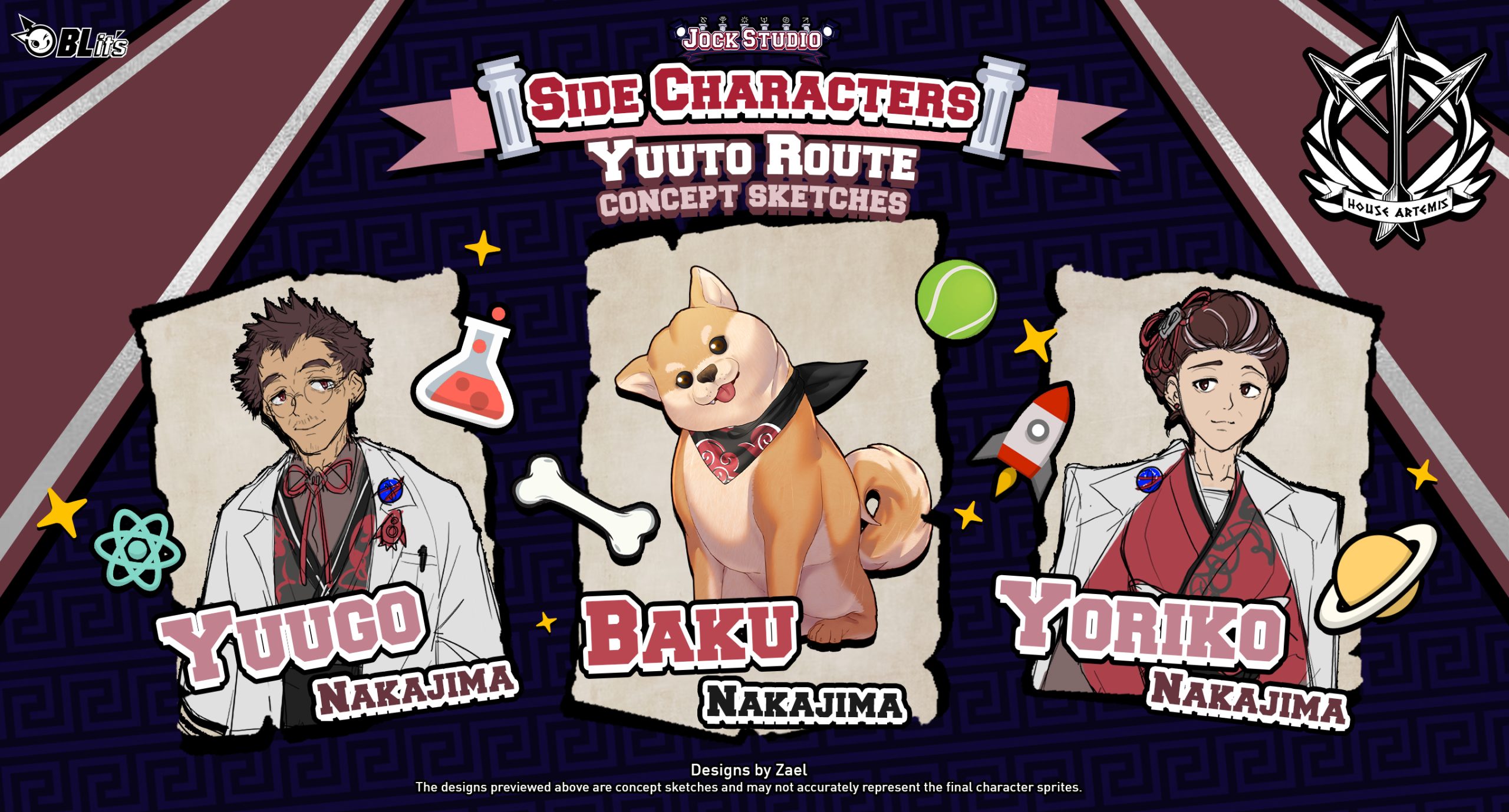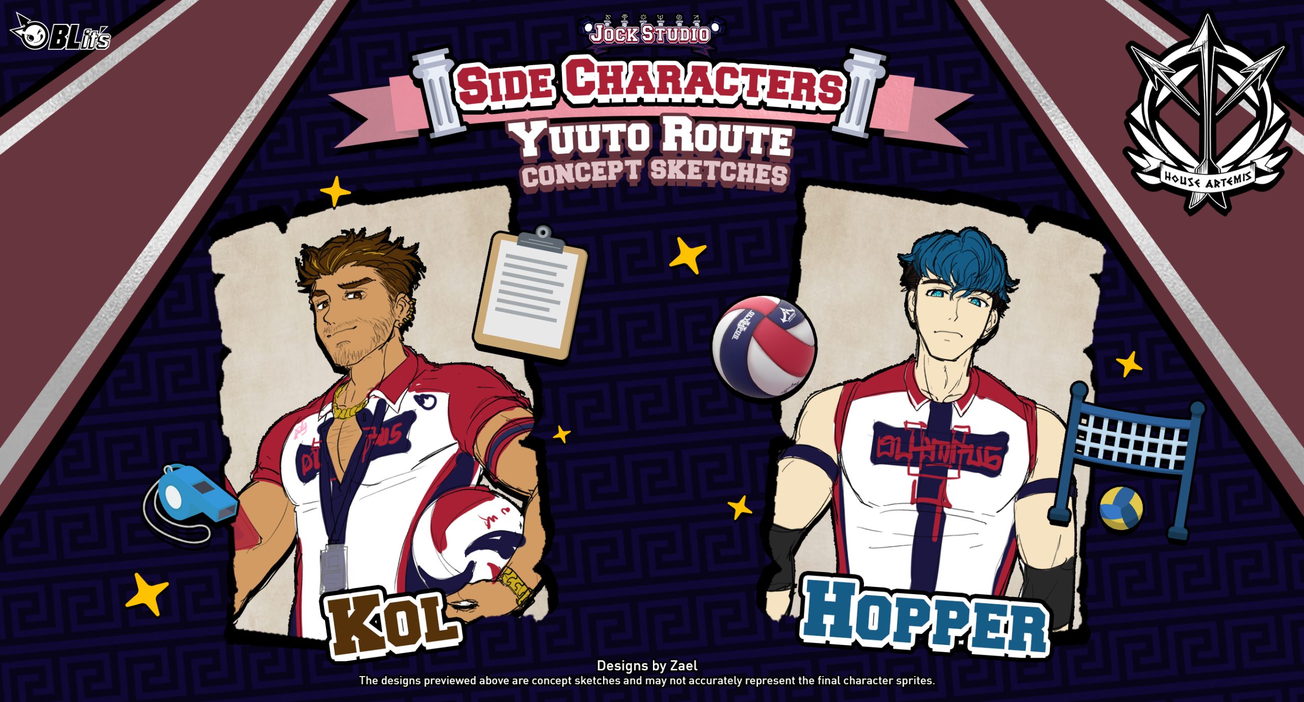 These three aren’t the only ones entering Yuuto’s story, though – some of his teammates join the cast as well! You might recognize both Kol and Hopper, two Varsity-tier backer characters who have become an official part of Yuuto’s story, with the approval of both of their backers! Kol serves the role of one of the coaches of the Artemis Volleyball Club, while Hopper is Yuuto’s talented teammate – get to know both of them in his story as part of the full game!