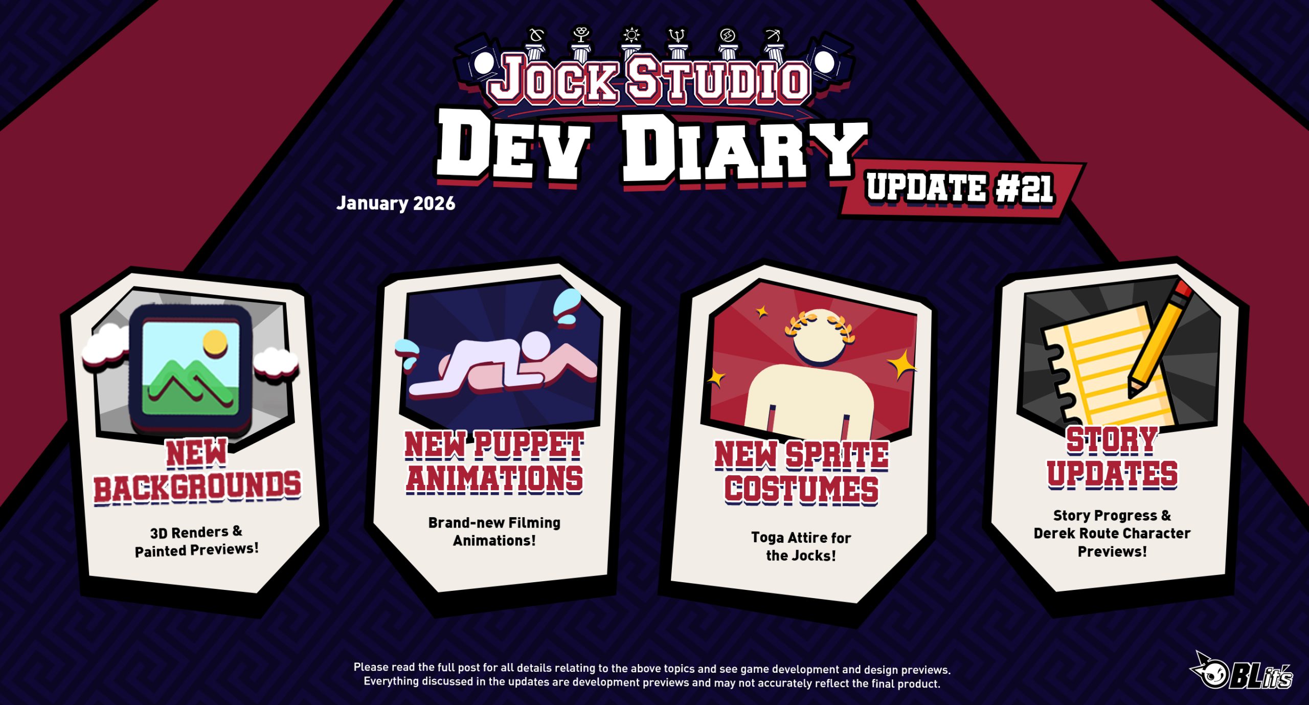 Fellow Olympians, it’s a brand-new year and time for a brand-new development update! Our team took a little break during the Holidays, but we’re back in full force this January, and have lots of exciting previews and progress on Jock Studio’s development to show! Please read the full post, as it contains information for all fans of Jock Studio and BLits Games!