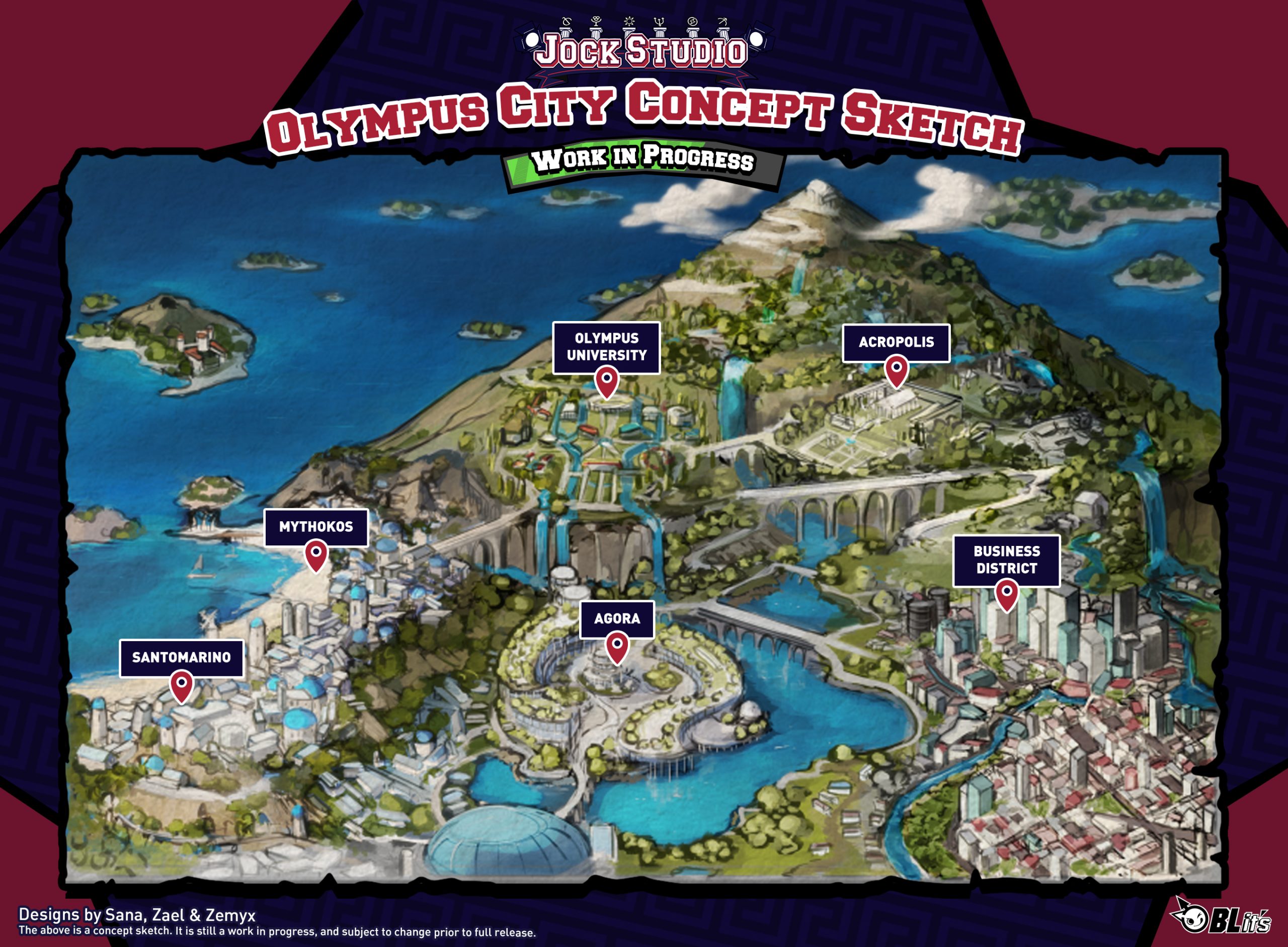 Starting off, we have an exciting new preview from the background department – our concept artist, Sana, has been working closely with Zael and Zemyx to work on the second, and equally as important, map for the world of Jock Studio – Olympus City! Check out a concept sketch below, revealing the full city for the first time: