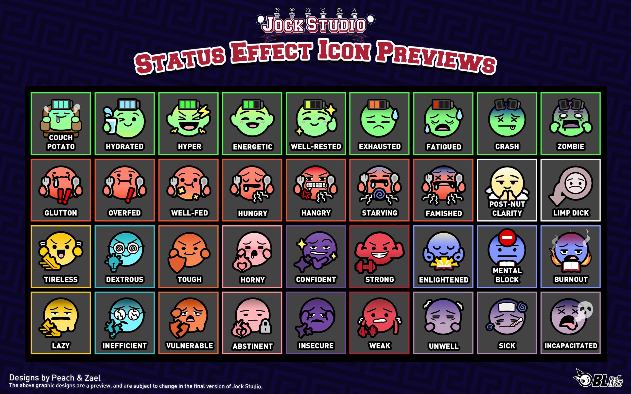 Next up, we have a preview from our Graphics Department – our Graphic Designer, Peach, has been working on creating icons for the various Status Effects throughout Jock Studio – check out their icons, as well as the names of the statuses, below!