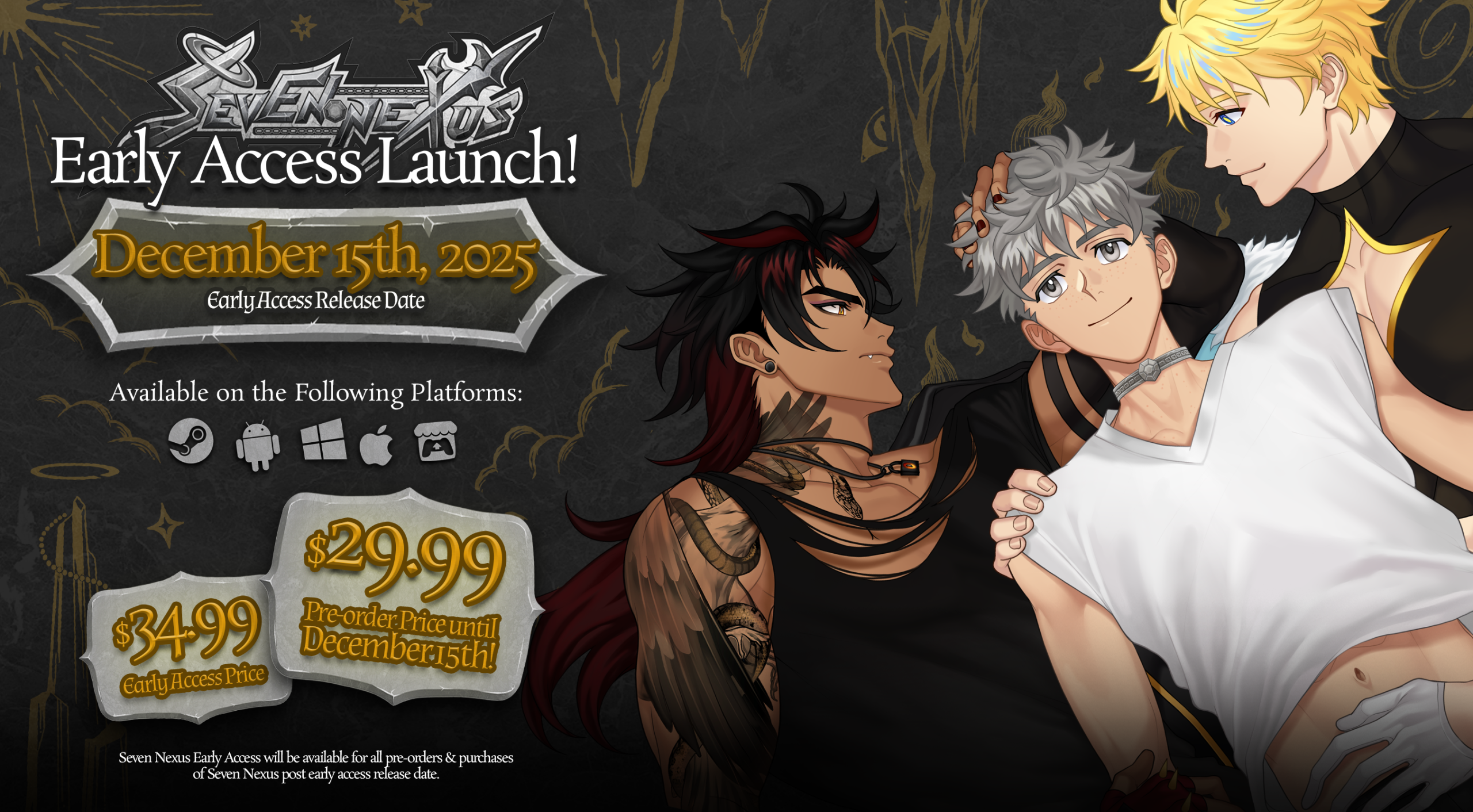 Anyone who pre-orders Seven Nexus prior to our Early Access release, as well as anyone who purchases Seven Nexus after the Early Access release will have full access to the entire Early Access period! Starting on the Early Access release date in December, you can download the full contents of the game so far, including the Prologue, Chapter 1, 2 and 3 on PC, Mac, Linux, Android or Steam!